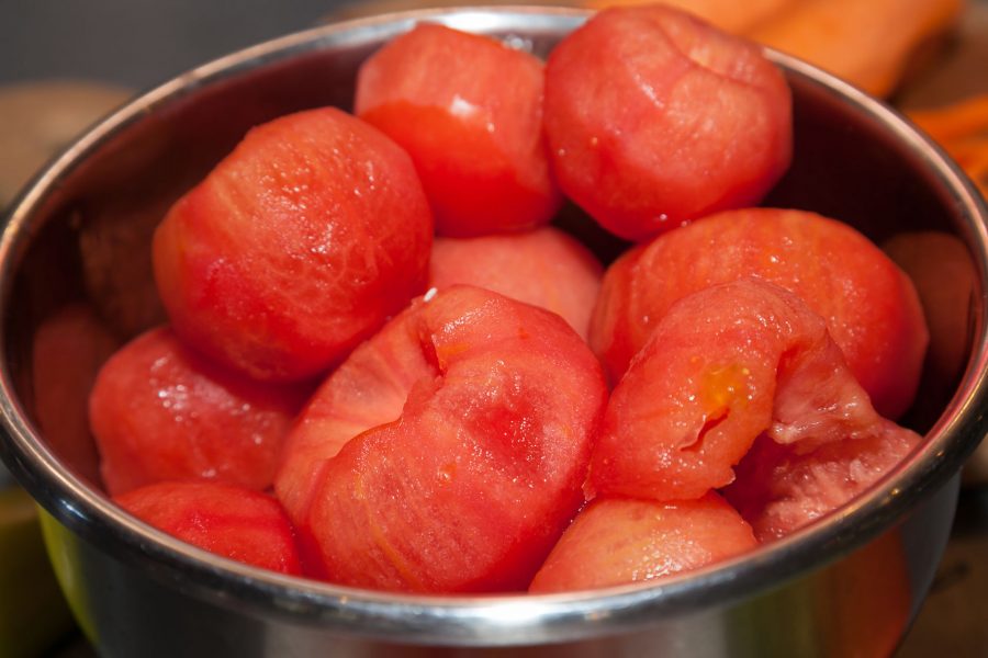 Realizar un corte superficial en forma de cruz en la base del tomate, sumergirlo en una olla con agua hirviendo durante unos segundos. Retirar y colocar en un bowl con agua fría.