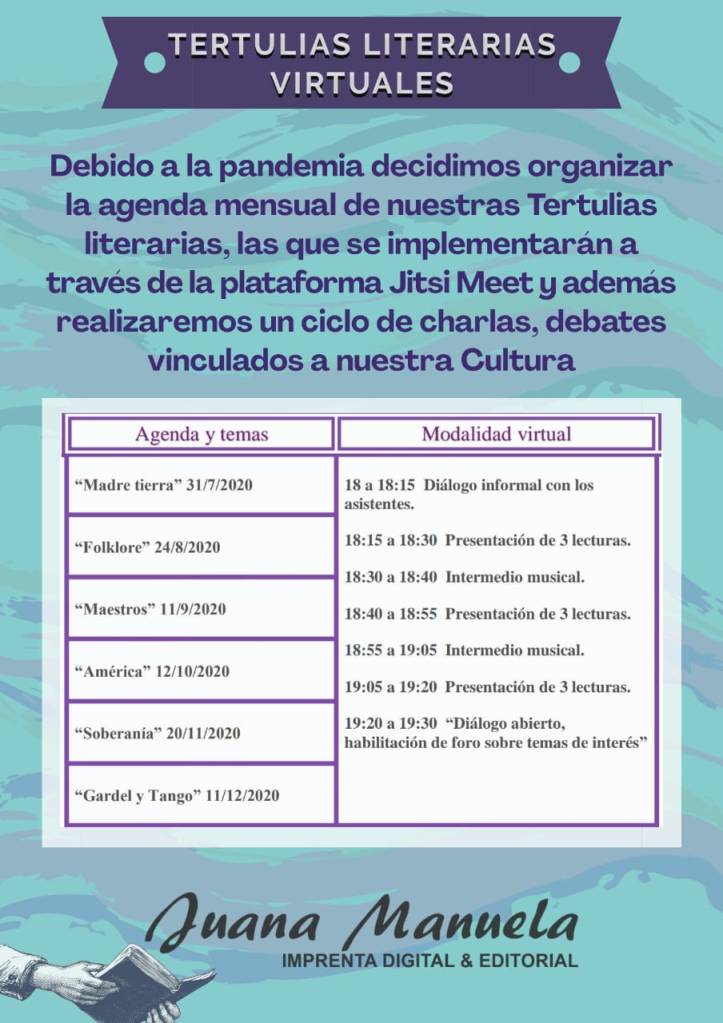 Amigos tertulianos seguimos apostando y fomentando nuestra cultura literaria; por lo que realizaremos Tertulias de manera online. Para ello los que deseen participar con sus lecturas deberán informar con anterioridad al correo juanamanuelaeditorial@gmail.com hasta un día antes del encuentro que tipo de texto sera el que compartirán, así podremos disfrutar de un momento agradable de lectura organizada.