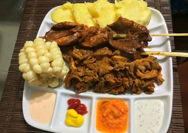 • Preparar la carne, para el corazón remover todos los nervios y membranas. Cortar en cubos de 2 x 2 cm. Cortar la carne de cordero dejando algo de grasa en cubos.