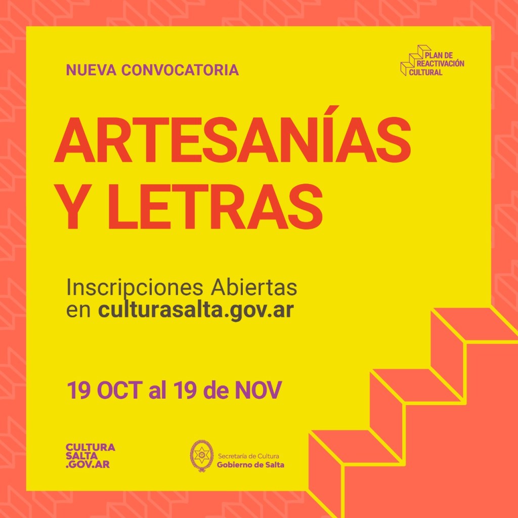 El Plan de Reactivación Cultural sigue avanzando. El lunes 19 de octubre comienzan las inscripciones para las categorías Artesanías y Letras. Postulaciones online o en las direcciones de cultura de cada municipio, hasta el 19 de noviembre.
