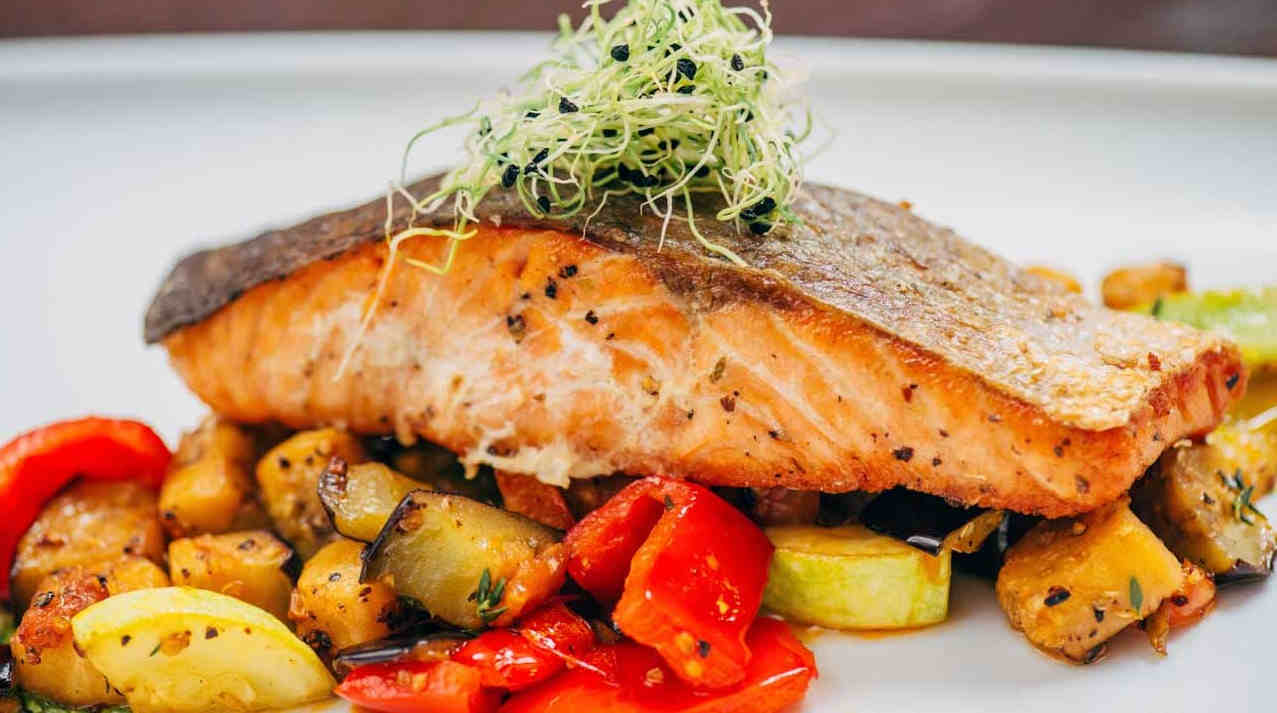 Retirar el salmón del horno, colocarlo sobre una bandeja, cubrir con las verduras.