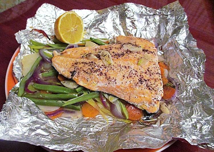 Colocar 500 grs de salmón, envolver el pescado con el papel, colocar el recipiente en horno precalentado a 200*, durante 20 minutos.