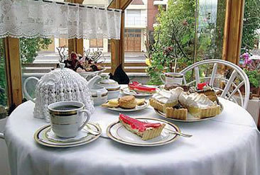 El té es servido en una tetera recubierta de una funda de lana tejida para conservar el calor y en elegantes tazas de porcelana. Entre las especialidades y exquisiteces típicas los comensales pueden disfrutar de la emblemática torta galesa, scones, tartas dulces o saladas, quesos artesanales, cremas típicas y dulces caseros.