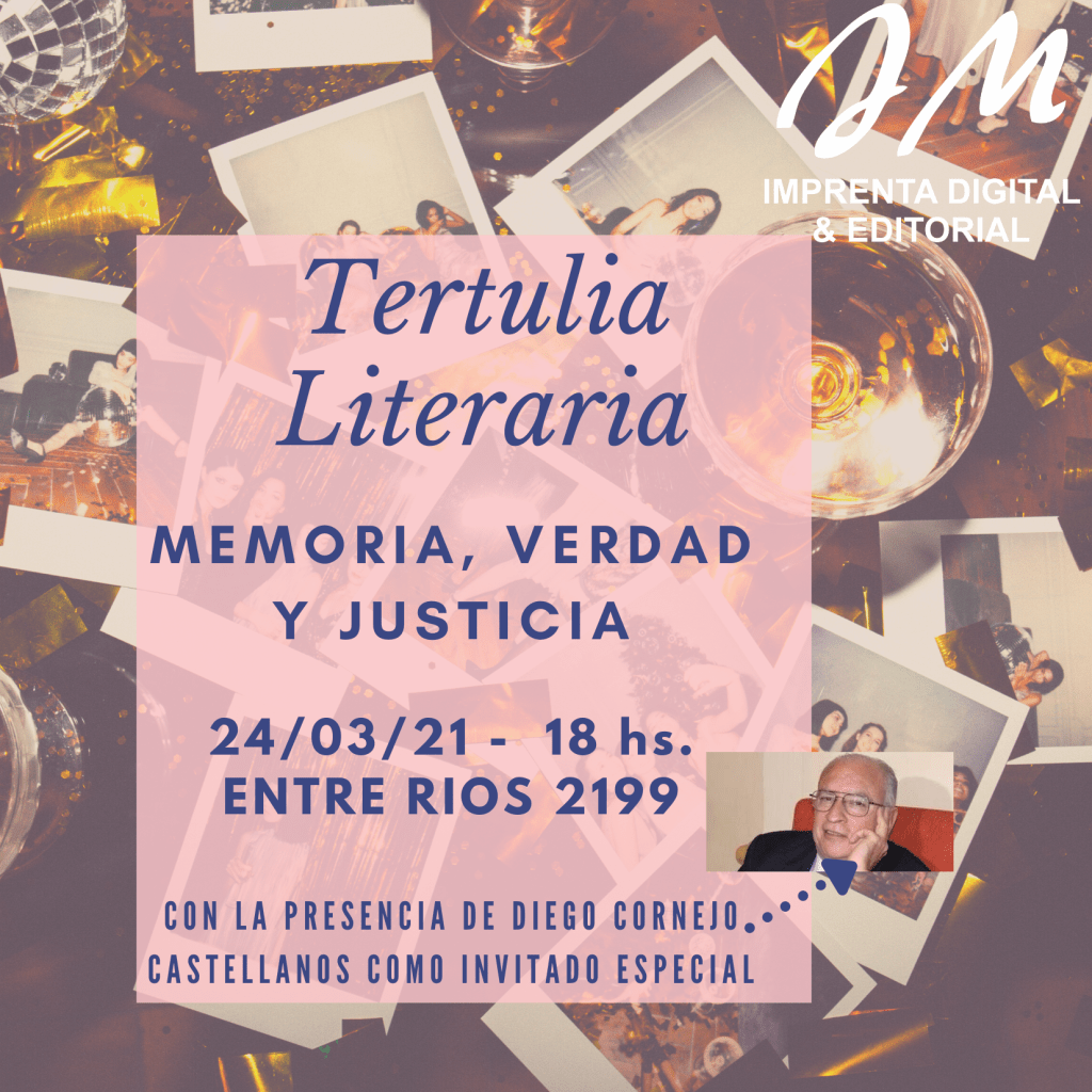 Los invitamos a la Tertulia literaria sobre el tema de Memoria, verdad y justicia, a realizarse el 24 de marzo a partir de las 18 horas, en Entre Ríos 2199 (frente a plaza España), para disfrutar un momento cultural de letras y música.
