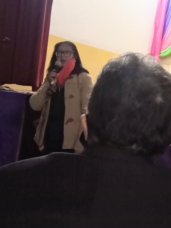 La escritora Mónica Ovejero comparte su poesía, mientras «La 5ta. Justa» se prepara ene el escenario para actuar.