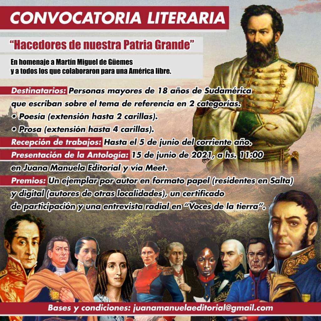 Para mayores informes pueden descargar el archivo de la convocatoria, tienen plazo hasta el 4 de junio de 2021 para presentar sus obras al correo de juanamanuelaeditorial@gmail.com.