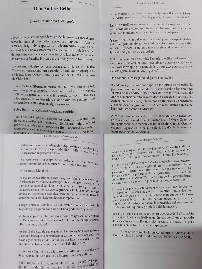 El autor hace referencia a una dedicatoria a Don Andrés Bello, de don Cristóbal Mendoza, «las brisas del Ávila mecieron su cuna y paseando sus florecidas orillas del pintoresco río Anauco, dejó oír los primeros acordes de su armoniosa lira. Discurrió su niñez y adolescencia en el estudio que nutrió su espíritu de índole elevadas y retemplo su carácter de suyo vigoroso por moderado y justo y a la par que estudiaba, hacía profesión de la enseñanza contando entre sus discípulos a Bolívar, el héroe ciudadano, el caudillo filósofo y poeta, el Padre de la Patria»