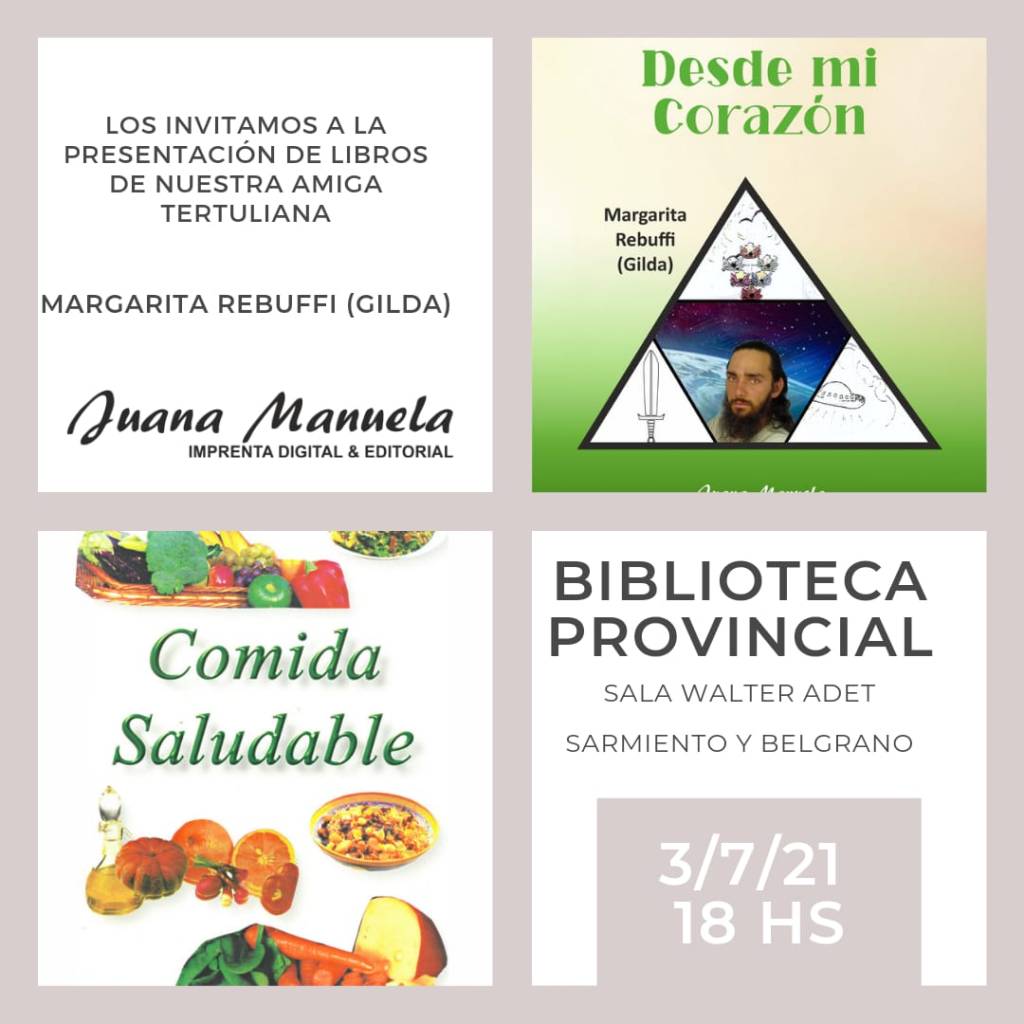 Este sábado 3 de julio se llevara a cabo la presentación de las obras escritas por Margarita Rebuffi, (Gilda) «Desde mi corazón» y » Comida Saludable», en la Biblioteca Provincial, sala Walter Adet a las 18:00 hs.