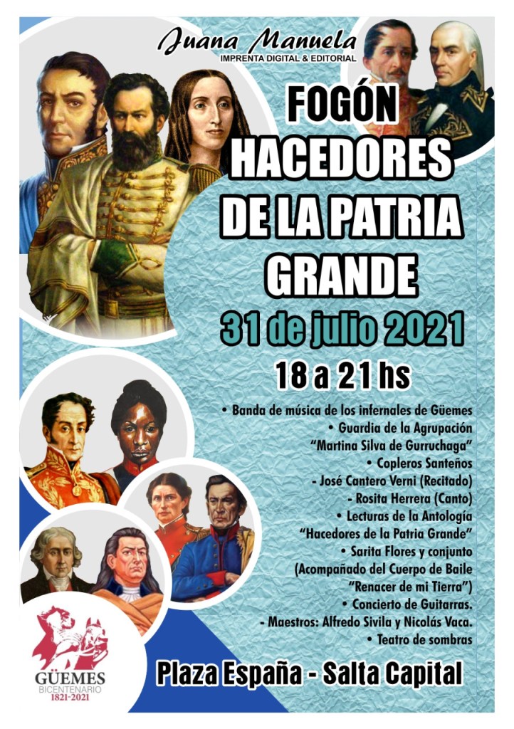 Considerando que estamos en año del bicentenario de nuestro querido héroe gaucho Don Martín Miguel de Güemes, quien fue junto con otros próceres de nuestra historia, un gran Hacedor de nuestra Patria Grande, es que decidimos organizar el “Fogón de los Hacedores de la Patria Grande”, con el sentido de homenajear a nuestro héroe gaucho, como así también a otras personas que dieron su vida para ver a nuestra América libre.