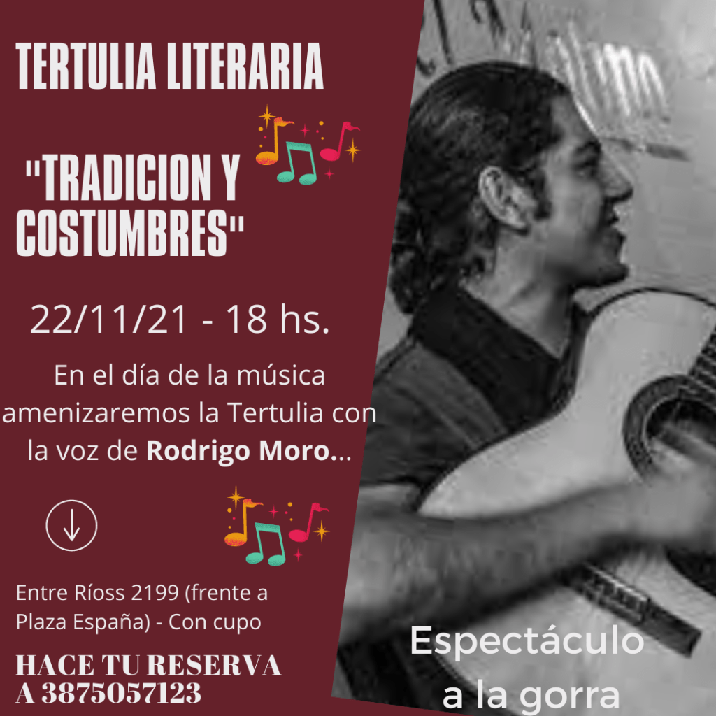 Como las letras y la música se amalgaman, hemos invitado a Rodrio Moro, un reconocido cantante, que recorre las peñas y los bares de nuestra ciudad, y también del país, llevando su canto. Pero además tiene el proyecto cultural Libreando, llevando en su carro libros de autores salteños para difundir nuestra cultura.