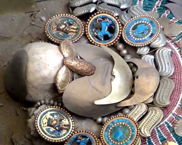 De todas ellas, destacaban una corona, pectorales de conchas, una sonajera y protectores de mentón, ojos y nariz; todas bañadas en oro. Al lado del gran Señor, estaban enterrados los esqueletos de ochos personas, las cuales serían de sirvientes, concubinas y guerreros.