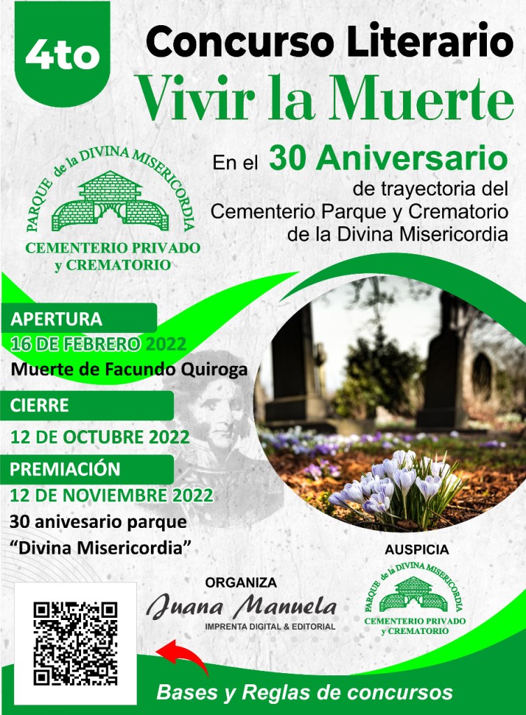 Cementerio Parque y Crematorio de la Divina Misericordia, cumple su 30° aniversario de trayectoria. Por ese motivo se realizará un concurso literario de poesías y/o cuentos cortos, los mismos no deben superar las 5 carillas. Accediendo con el código QR podrán conocer las bases y condiciones del mismo, también pueden solicitar información a juanamanuelaeditorial@gmail.com