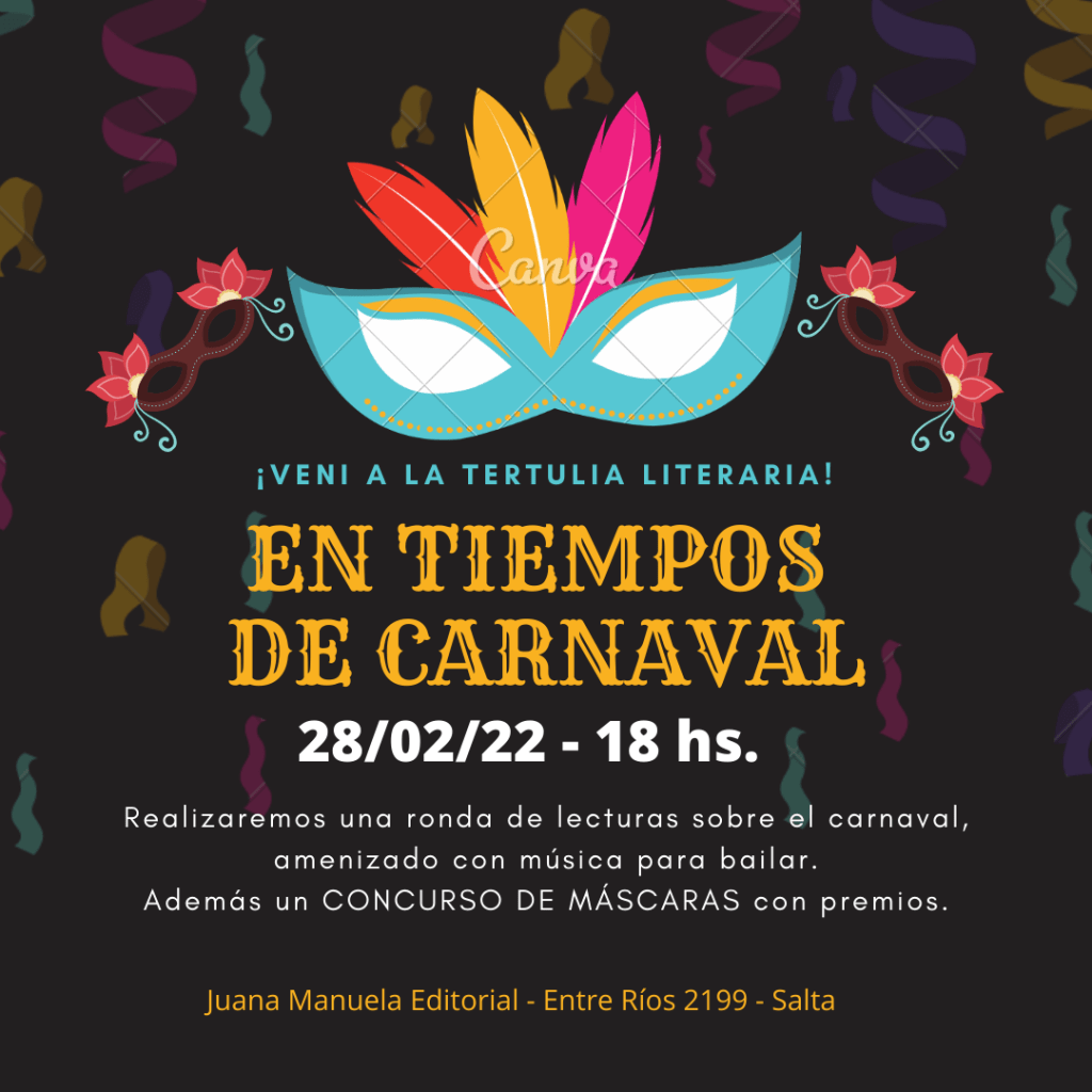 Pero por supuesto que no dejamos de lado lo literario, ya que habrán rondas de lecturas referidos al Tiempo de carnaval y trasmitiremos la misma por face así los que no puedan asistir puedan hacerlo virtualmente.