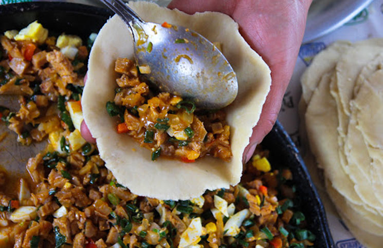 Agregar la cebolla de verdeo picada y los huevos duros picados justo antes de armar las empanadas. Cocinar en horno a 250º C durante unos 12 minutos o freír en abundante grasa de pella.