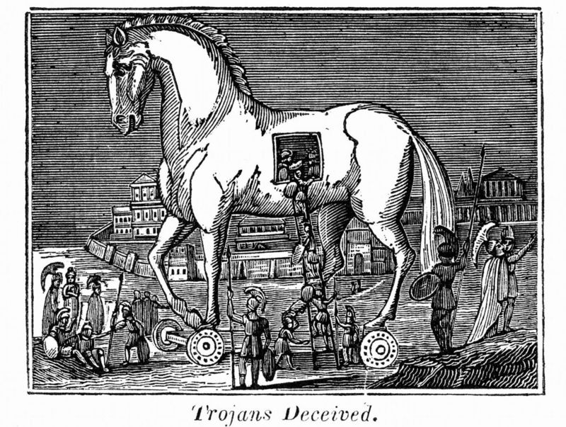 Seguramente recordaran la historia del caballo de Troya, un artilugio usado por los aqueos (griegos) en la guerra de Troya para engañar a los troyanos, a través de un enorme caballo de madera, simulando un regalo como prueba de pacificación; cuando en realidad el fin consistía en rescatar a Helena, esposa del rey Menelao, la cual fue raptada por Paris, príncipe troyano.