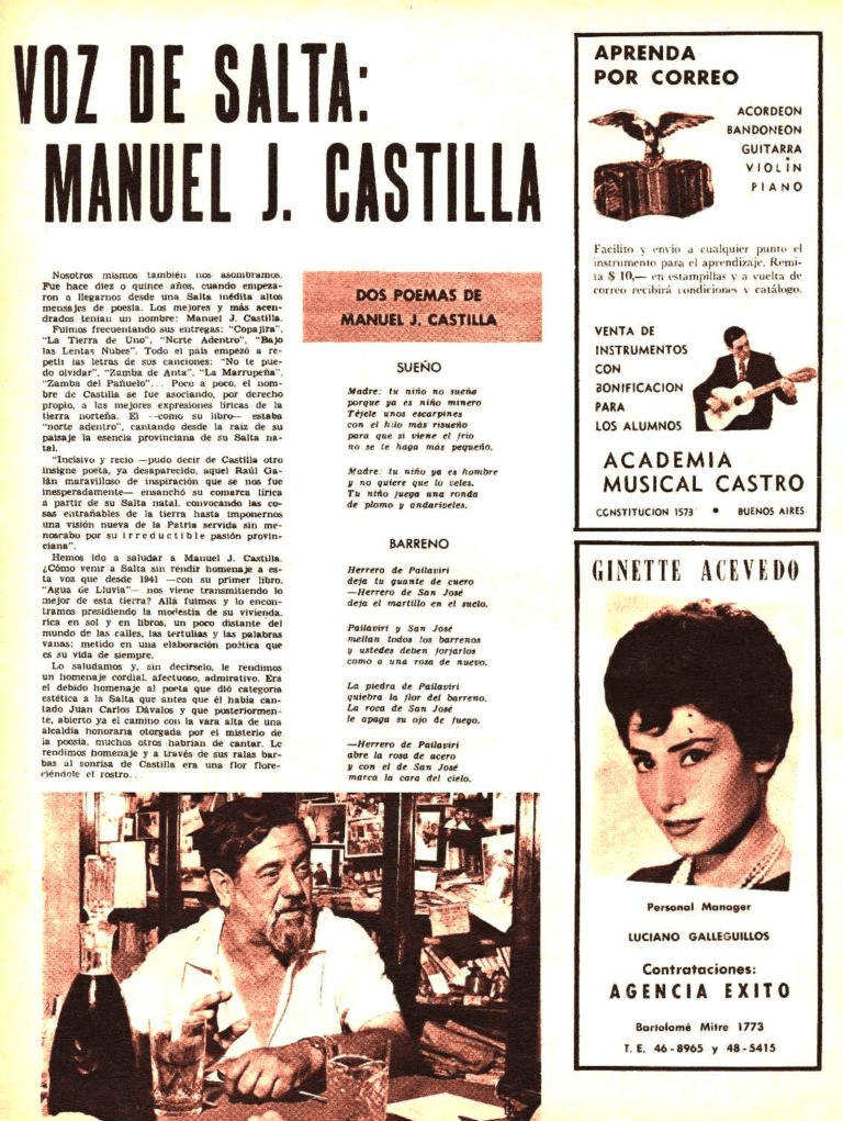 El 18 de abril de 1967 en el Número 144 de su publicación se hace presente en un articulo breve pero contundente, el genio y la pluma de Manuel Castilla. Buenos Aires hablaba del poeta y Salta sería bautizada como Tierra de poetas.