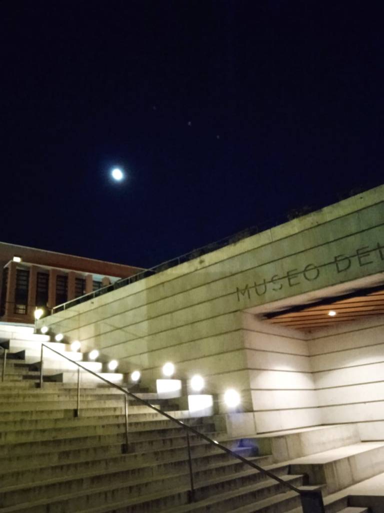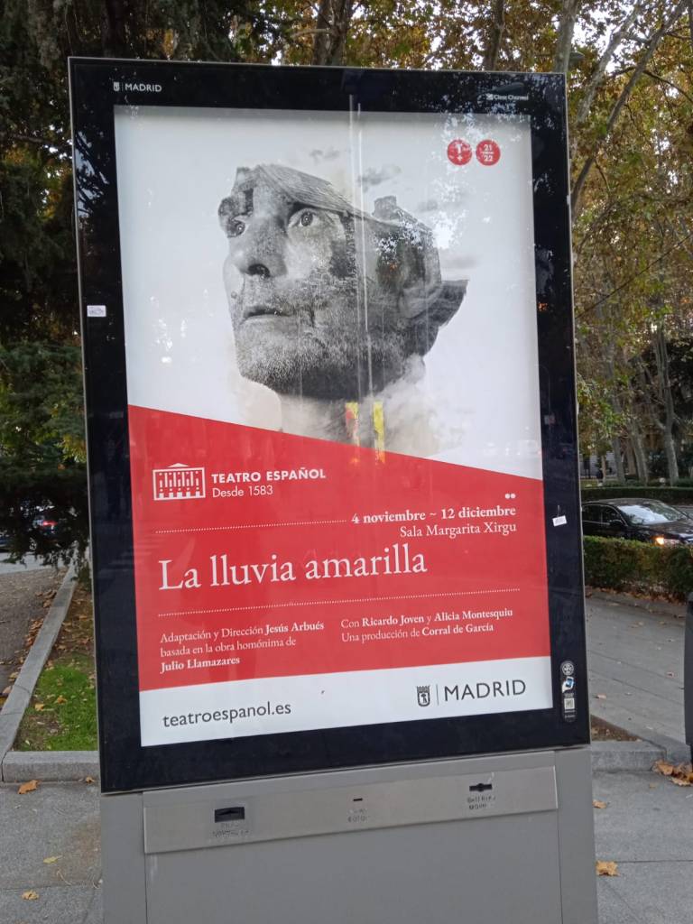 Una luna enorme en un cielo profundamente negro custodia la salida del museo, hace muchísimo frío, un afiche enorme de LA LLUVIA AMARILLA, del escritor español Julio Llamazares anuncia su obra llevada al teatro.