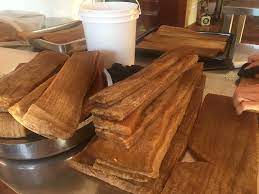 A través de un proceso de cortes especiales, como su extracción, hidrolisis, gelificación etc., se obtiene un cuerpo tierno y sabroso que conserva todas las características del leño, vetas, anillos de crecimiento entre otras.