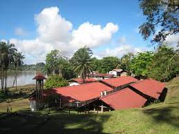 Precediéndome por el camino que conduce a largas cabañas sobre pilotes con techos de hojalata y paredes de listones, comenta el recorrido como propietario.