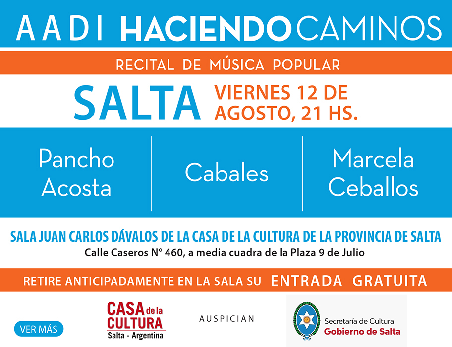 La Asociación de Argentina de Intérpretes AADI tiene el agrado de presentar el día 12 de agosto a las 21 hs, en la Sala Juan Carlos Dávalos de la Casa de la Cultura de nuestra Ciudad, el recital de música popular AADI Haciendo Caminos.