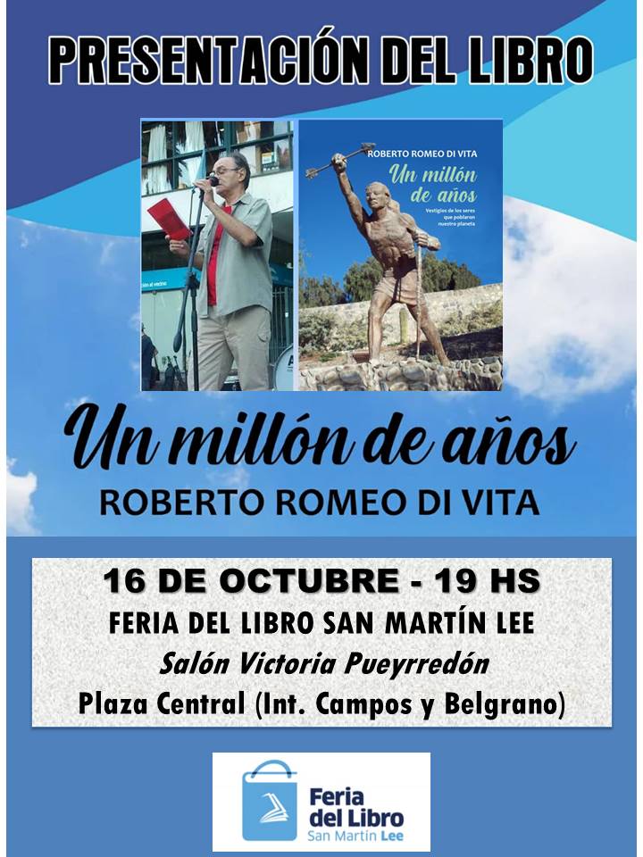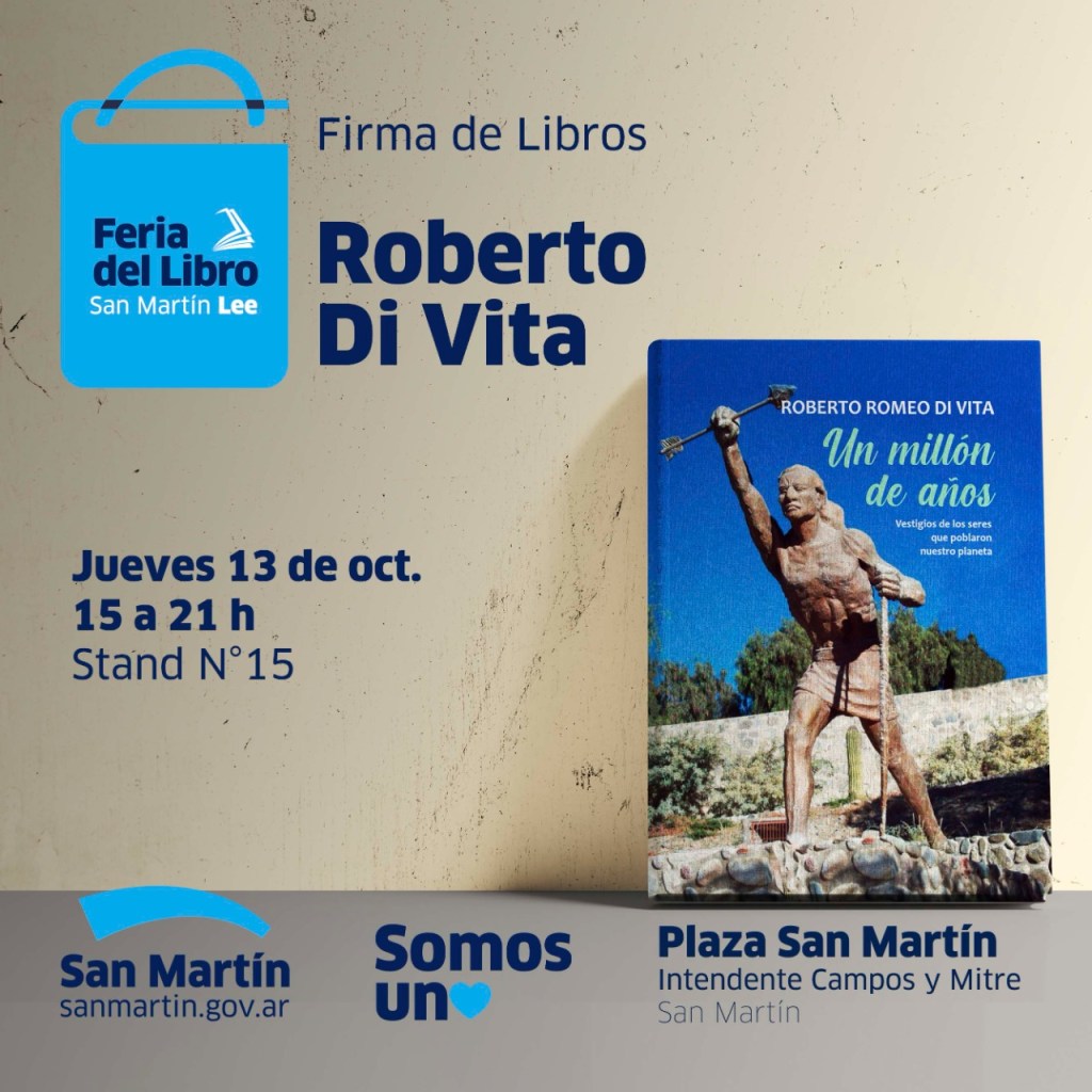 Y también desde la localidad de San Martín, provincia de Buenos Aires, se presentará el libro de otro amigo Roberto Di Vita, en el marco de la Feria del libro de San Martín, cuyo título es «Un millón de años«, una obra poética donde se evidencia el sentir patrio y libertario, presente en las voces de tantas personas que han construído nuestra Patria.