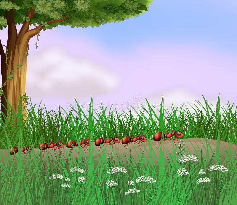Las hormigas en fila india, formaban una procesión a veces curva, a veces recta bajando y ascendiendo; era como un río de insectos en éxodo hacia una nueva tierra.