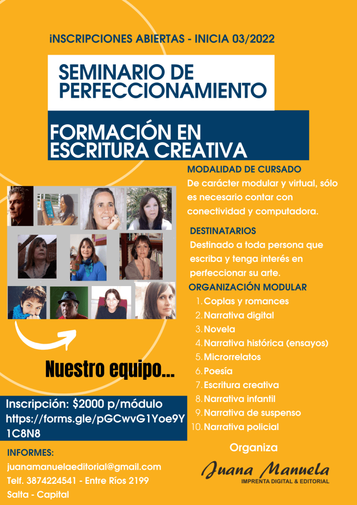 También iniciamos el Seminario para escritores «Formando en escritura creativa«, lo que nos permitió conocer escritores de otros lugares y sobre todo, utilizar las nuevas tecnologías para conectarnos y formarnos. Se logró conformar un equipo de especialistas de gran nivel literario, y eso le dió un plus especial al Seminario. Nos quedaron 3 módulos que seguramente se desarrollarán en el 2023.