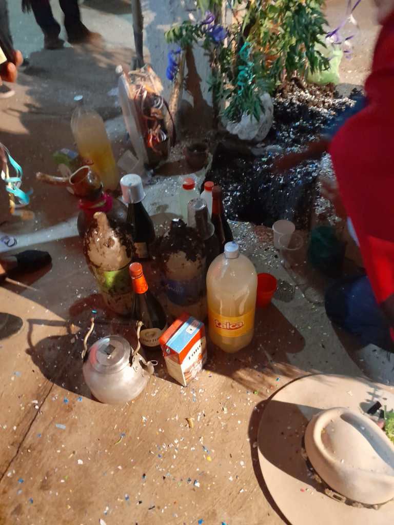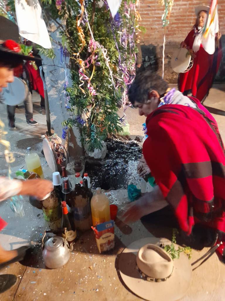Antes de comenzar la ceremonia del desentierro del carnaval, los participantes se unen en un rezo para pedir a Dios que la alegría se renueve y todo transcurra en paz; luego se encomiendan a la Virgen para que proteja la vida de todos los participantes durante esos días, especialmente.