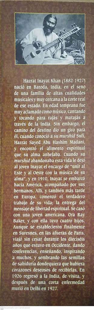 Pero, continuando con el libro hallado, de Gayan Vardan Nirtan, de Sofía editores, y quien es el compilador de los escritos de Hazrat Inayat Khan, (1882-1927); músico y conferencista hindú, que quiso dejar un legado a la humanidad de oriente y de occidente.