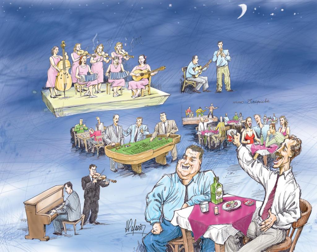 Nocturnidad. Duendes se insomnian en boliches de medias pulgas. Brincan entre gestos, vasos, botellas. Despiertan carcajadas fraternas. Una fiebre de guitarras alucina la bohemia. Plaza Alberdi. Estación del Mitre. Andenes de la soledad. Espera que desespera. Escolaso. Flores del cabaret que beben un trago a la salida del trabajo. Le ofrecen su cariñoso escote al parroquiano. El violín de Alfredo Grillo. La guitarra de Federico Nieva. Celebran la vida en los reservados de El Mairata. A media cuadra, carcajea “El 55”. Humo. Voces. Charla. Gritos. Confesiones. Angustias. Poesía del llanto. Del arrepentimiento. Canto. Amistad. Entre croupiers, damas de la vida, intelectuales, estudiantes, timberos, cantores, una chacarera se dispara rozando el alba. Las hermanitas Carmona. Pepe y Gerardo Núñez muerden sueños en las gargantas. El son de la guitarra agita ahora sus ojos nocharniegos. Por un boliche de El Bajo circula una zamba. Canta El Gallo de Oro, en 24 de Septiembre casi avenida Avellaneda. El boliche moja con un cincuenta y cincuenta la sed de los comensales. Gatos y chacareras juegan con las ciegas pupilas del Ciego Pancho.