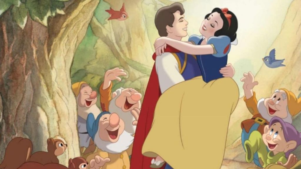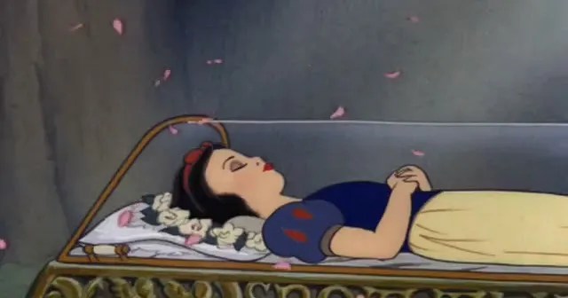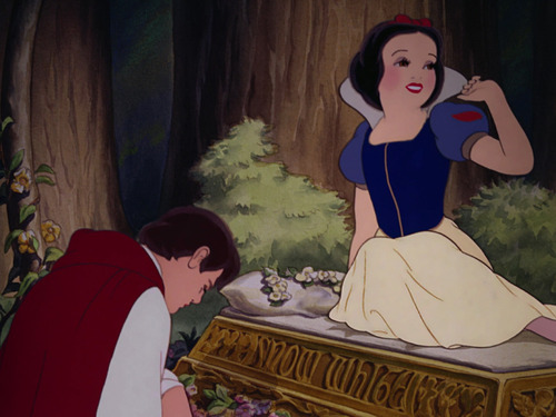 El Amor hace su aparición en la figura de un príncipe que se enamora al verle rogándole a los enanitos que le permitan cuidarla, asunto que es aceptado por ellos; y mientras es transportada, la manzana envenenada sale de su boca y despierta.