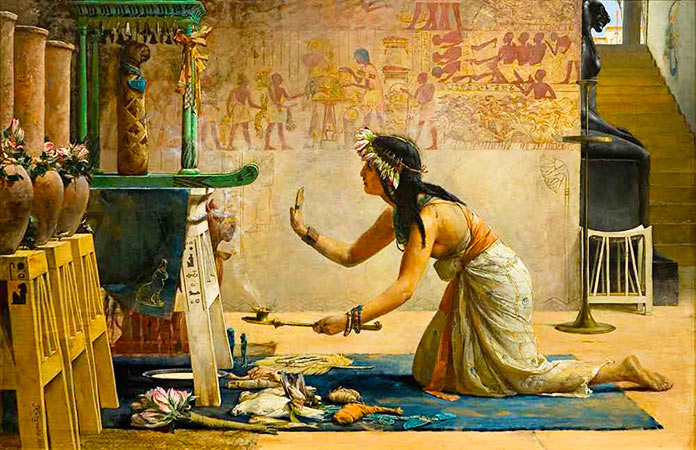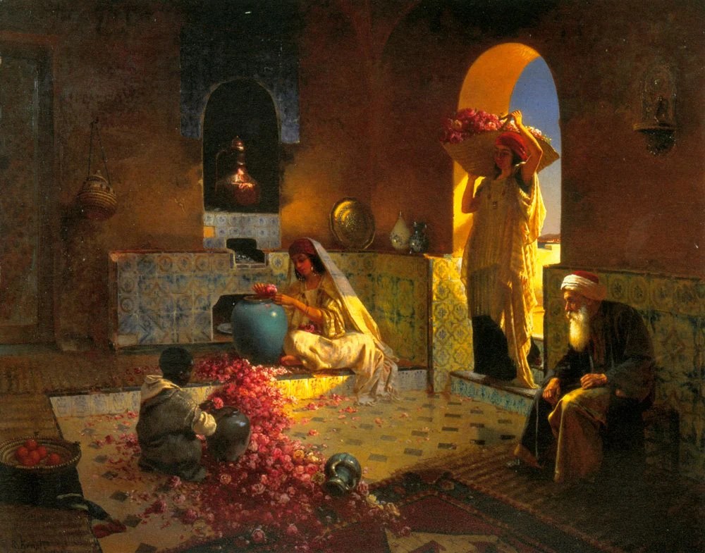 En la antigüedad, la elaboración de un perfume era muy simple: el aroma se fijaba en una sustancia grasa que, generalmente era aceite de oliva, aunque también usaban el de sésamo o el de lino. A esta base líquida y grasosa, le añadían conservantes y colorantes como el cinabrio o la orcaneta de flores amarillas, aportando las fragancias, destacando el perfume de rosas, entre la mirra, la canela, el azafrán, el nardo, el narciso o el membrillo.
