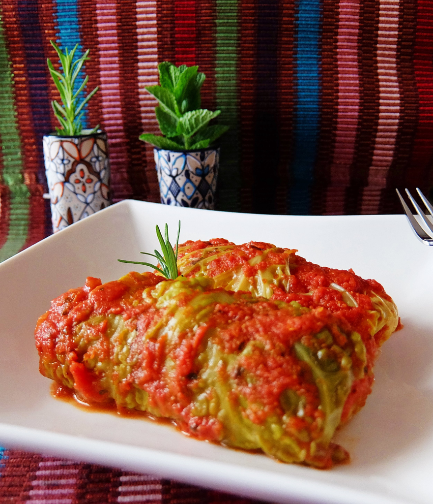 Escogemos 6 hojas de col, las lavamos. Las ponemos en una olla con agua hirviendo, con sal y unos granos de comino, unos diez minutos, sacamos, enfriamos con agua fría y escurrimos muy bien.