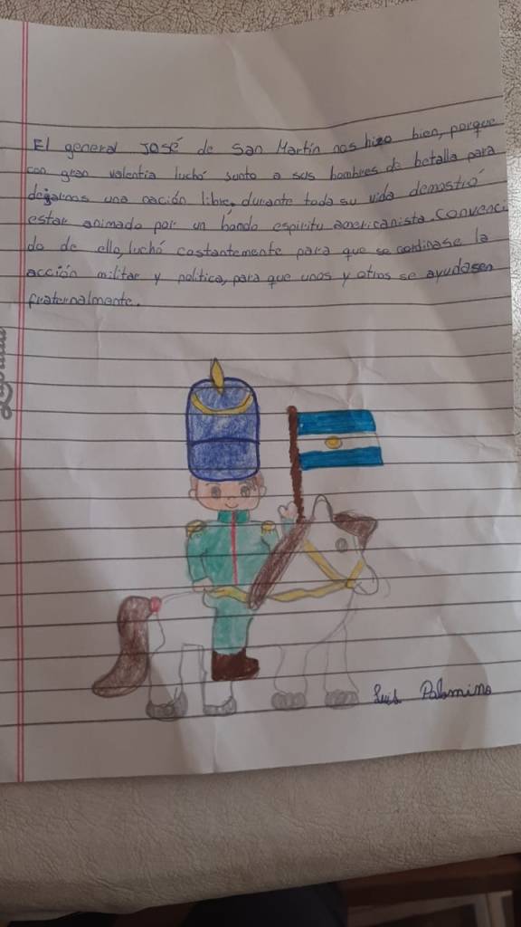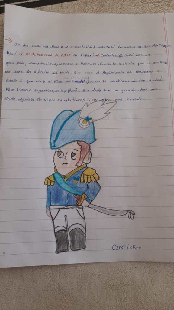 Cada niño, con su corazón comprometido, creó una producción única. Algunos optaron por producciones escritas, detallando sus percepciones y emociones con respecto a San Martín. Otros encontraron su voz en forma de poesías y coplas, transmitiendo su admiración a través de versos cuidadosamente elaborados. Las dramatizaciones y los recitados también encontraron su lugar, permitiendo a los niños explorar no solo la historia, sino también experimentarla.