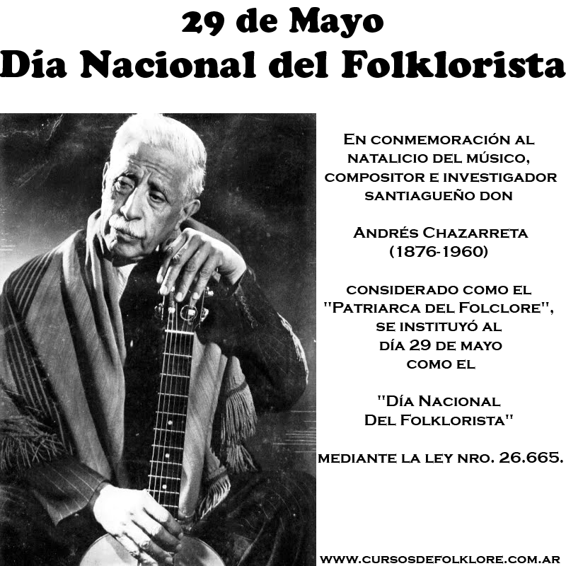 El 29 de mayo se celebra el Día Nacional del Folclorista. La fecha fue instituida en 2011 por la Ley Nº 26.665, en memoria del nacimiento de don Andrés Chazarreta (1876-1960), patriarca del Folclore.
