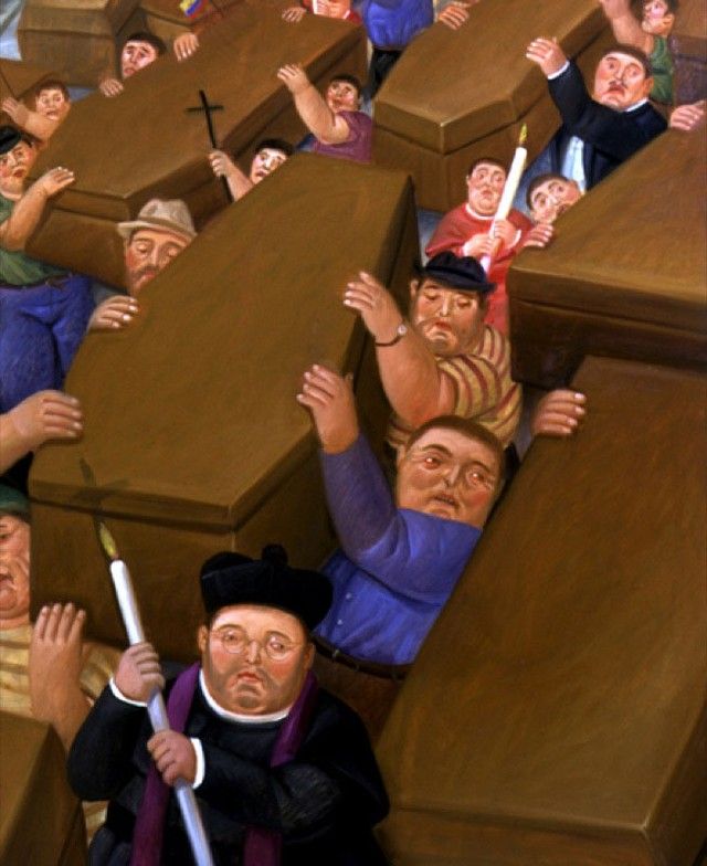 De la violencia y el dolor, que fueron grandes temas en sus pinturas, nos sobrecogen todos sus cuadros sobre los horrores de la guerra: Violencia Conservadora y Liberal, donde un esqueleto danza sobre los muertos, Masacre paramilitar en Mejor Esquina, La muerte de Pablo Escobar, Carro bomba, La Barbarie, El dolor de Colombia, y muchas obras más; pero hay una obra que conmociona nuestra psique: El desfile, donde pinta una procesión que se ilumina con cirios, las casas derruidas, una monja seca sus lágrimas con un pañuelo y los deudos sostienen en sus hombros los ataúdes de los muertos y en el aire planea un gallinazo.