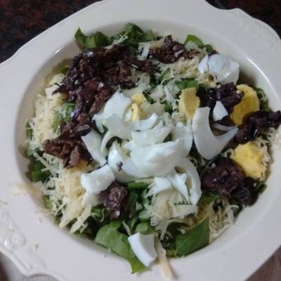 Lavar bien un atado de radicheta, picarla al gusto, agregar: 2 dientes de ajo bien picaditos, 2 huevos duros picados medianos, ½ taza de queso rallado grueso, aceitunas negras picadas, mezclar, condimentar con aceite de oliva (o al gusto), sal, vinagre de manzana o limón.
