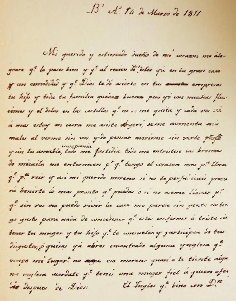 «Mi querido y estimado dueño de mi corazón, me alegraré que lo pases bien y que al recibo de esta estés ya en tu gran casa con comodidad y que Dios te dé acierto en tus empresas; tu hijo y toda tu familia quedan buenos, pero yo con muchas fluctuaciones y el dolor en las costillas que no se me quita y cada vez va a más; estoy en cura, me asiste Argerich, se me aumentan mis males al verme sin vos y de pensar morirme sin verte y sin tu amable compañía, todo me fastidia, todo me entristece, las bromas de Micaela me enternecen porque tengo el corazón más pa llorar que pa reír, y así mi querido Moreno, si no te perjudicas procura venirte lo más pronto que puedas o si no haceme llevar porque sin vos no puedo vivir, la casa me parece sin gente, no tengo gusto para nada de considerar que estés enfermo o triste sin tener tu mujer y tu hijo que te consuelen y participen de tus disgustos; ¿o quizás ya habrás encontrado alguna inglesa que ocupe mi lugar? no hagas eso Moreno, cuando te tiente alguna inglesa acordate que tenes una mujer fiel a quien ofendes después de Dios……».
