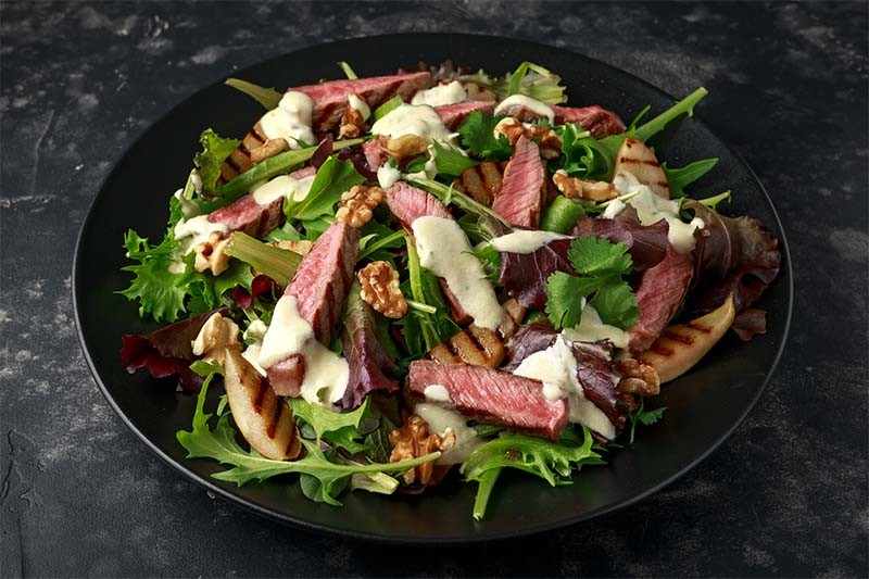 Cuando necesitamos que la ensalada sea plato principal, podemos preparar ensaladas de hojas verdes, tomates, pepinos, cebollas, huevos duros, quesos, carnes cocidas, fiambres en tiritas o daditos, aceitunas, frutos secos, etc…podemos agregar a todo esto: