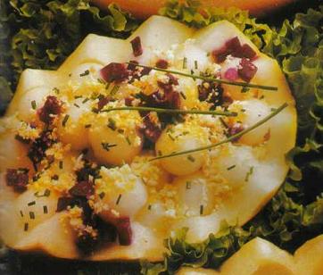 Hervir remolachas, enfriar, cortar en daditos, incorporar melón cortado en dados, aderezar con sal y crema de leche.