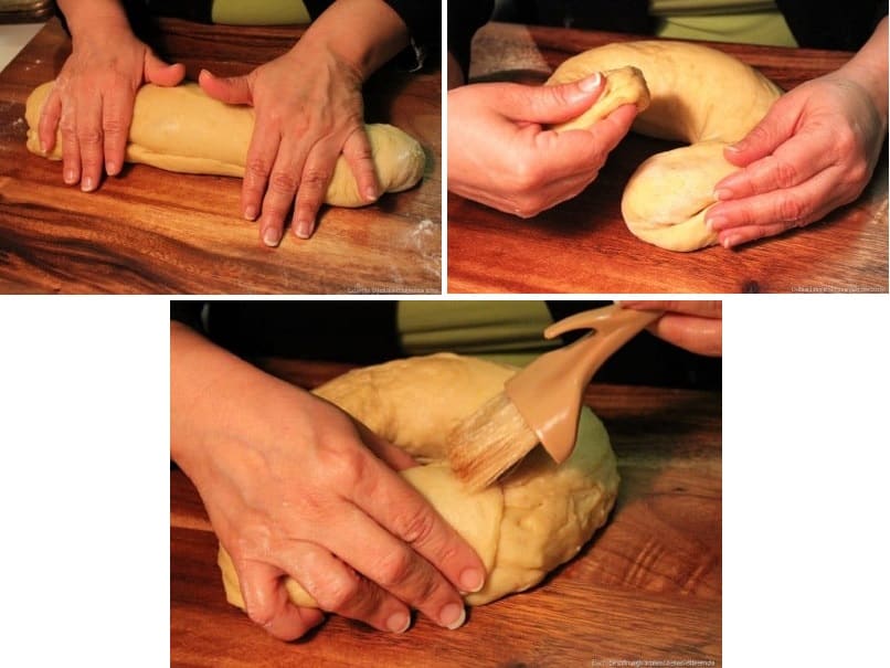 Desgasificar la masa y hacer una rosca. Colocar la misma sobre una placa enmantecada o cubierta con papel manteca. Dejar reposar y nuevamente dejar que duplique su volumen.