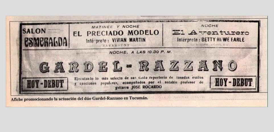 Las imágenes de un jardín otoñal caminan por las mesas ese 9 de mayo de 1919. En el Salón Esmeralda, de Muñecas 284, la emoción tucumana se despabila durante cuatro noches con ese puñado de canciones criollas que regala el dúo que conforma con José Razzano. La proyección de dos películas antecede a cada actuación.