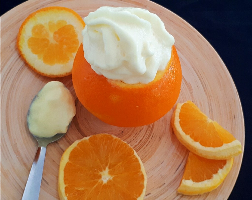 Para preparar una deliciosa CREMA de NARANJA, en primer lugar lavar 6 naranjas ( esta cantidad depende de los comensales), partirlas por la mitad (bien prolijas), sacar las semillas, exprimirlas, reservar el jugo, retirar de las mitades el hollejo, tratando de no romper la cáscara.