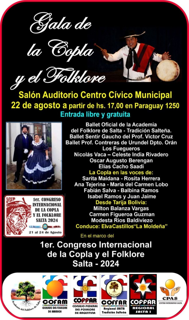 La gala de la copla y el folklore, como sello de identidad en el COFFAR reunió a los bailarines y cantores. Mercedes Villagra y Leonardo Carabajal, directores del ballet “Tradición Salteña” provocaron encantamiento con su danza.