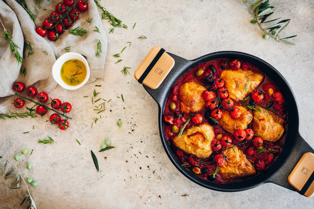 Este plato de pollo al romero con aceitunas negras y alcaparras se puede acompañar de un arroz en blanco o bien algo más ligero, con una ensalada verde o papas doradas.