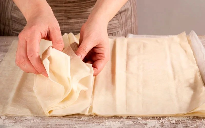 La masa filo está hecha de harina de trigo, agua, un poco de aceite y algunas gotas de raki (anís turco) o de vinagre de alcohol.