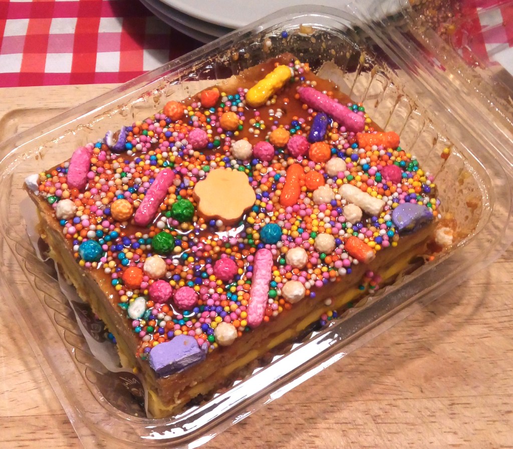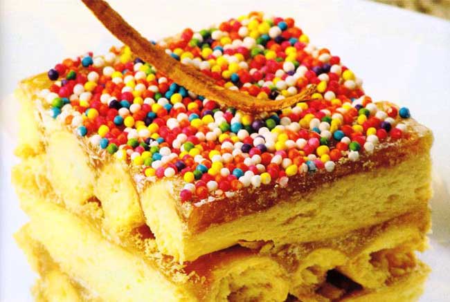 Completar en total tres capas de palitos cubiertas con miel. Decorarlas con grajeas de colores en la superficie y cortar con cuidado los bordes. Finalmente, disfrutar de este delicioso manjar.