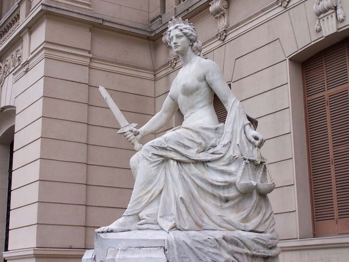 La imagen del Trabajo se ubicaba al lado, era un joven musculoso, adelante, la Justicia se mostraba desafiante con su cuerpo semidesnudo, mientras cubría sus piernas con una túnica larga. El curioso detalle es que estaba sin la típica venda sobre sus ojos, con una espada en la mano y escondiendo la balanza de la justicia.