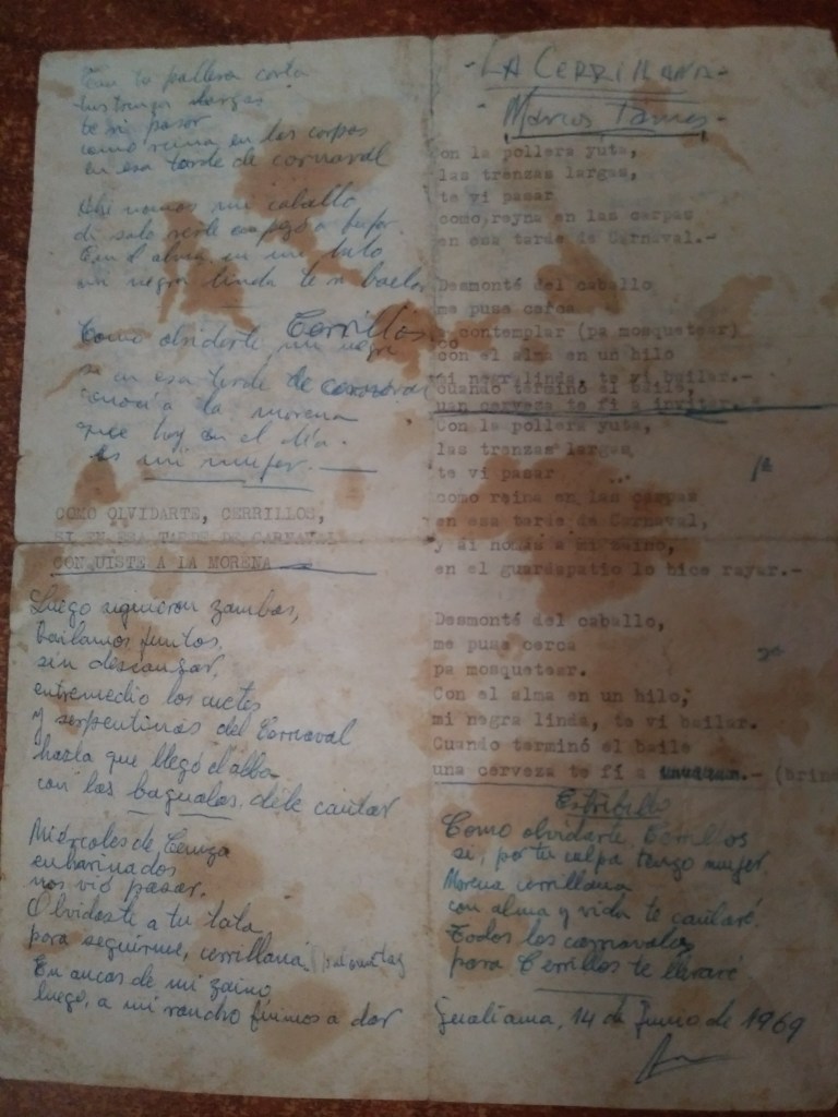 Esta es la letra original de la Cerrillana que ha sido encontrada en un montón de papeles que tenía mi padre en casa, fechada en el año 1969, que era más larga y luego fue adaptada por Los Chalchaleros cuando la grabaron.