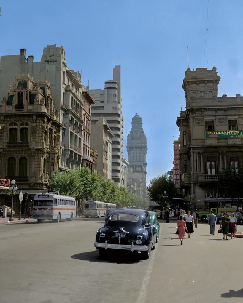 “Es el palacio Salvo que fue construido en la década de 1920. En esa época, se llamaba palacios a los hoteles, ahora funcionan departamentos”, les dice un hombre.